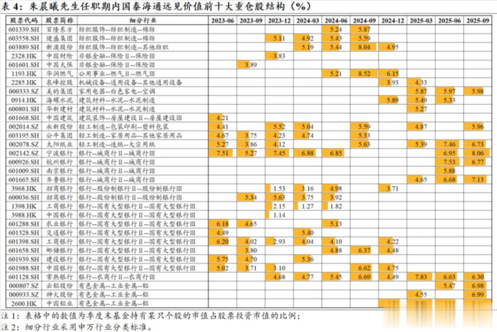 朱晨曦曾表示不喜欢快速变化的行业,更青睐有永续经营特征的领域,其能力圈也集中在研究员时期深耕的金融、轻工制造,以及后续拓展的交运、化工、有色等传统行业。这一偏好与基金持仓高度契合,从该基金不同时期的重仓股能清晰看出端倪。