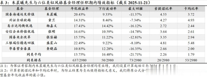 从回撤来看,国泰海通远见价值的风控也居前。自2024年1月1日以来,截至2025年11月21日,产品的下行波动率和最大回撤分别位居全市场同类基金的前2%和前3%;而与六位类似风格基金经理相比,两项指标也均排在第3/7位。